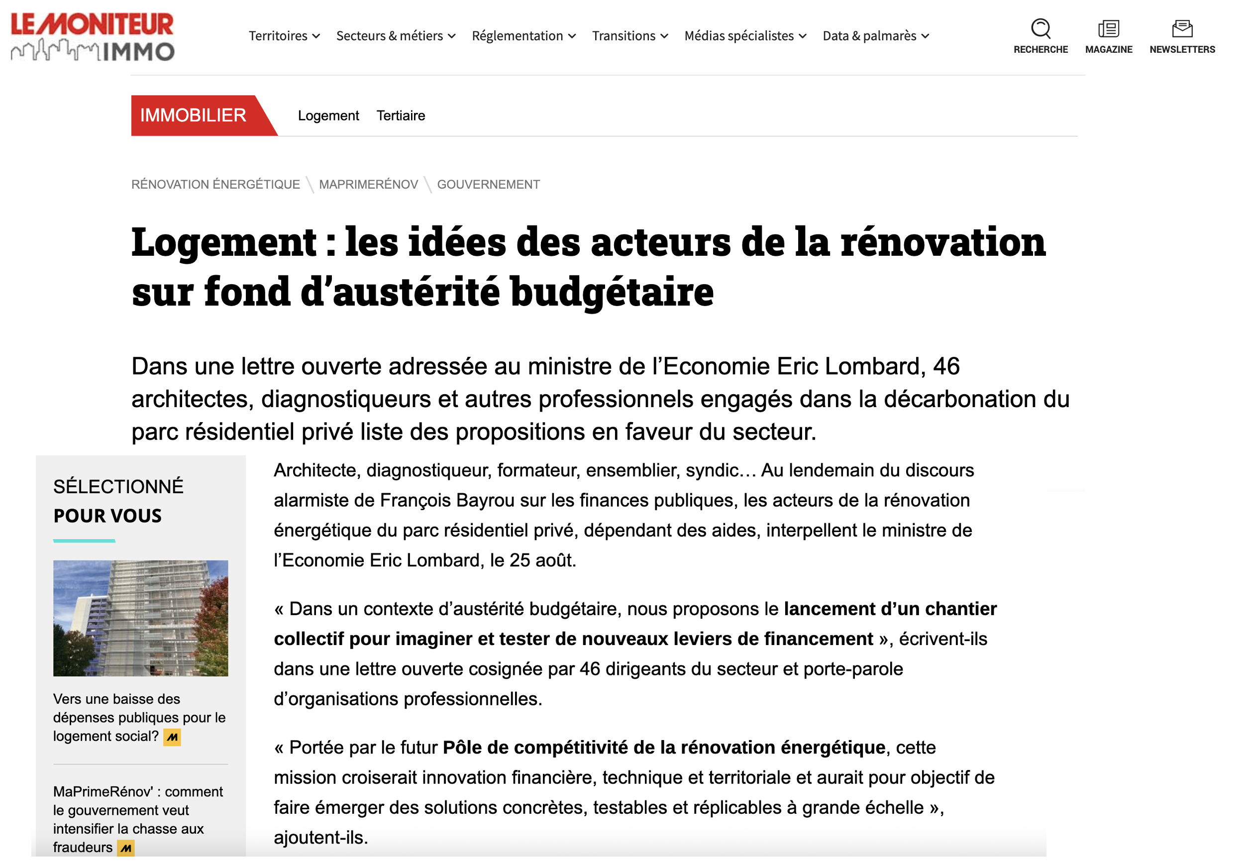 Logement : les idées des acteurs de la rénovation sur fond d’austérité budgétaire.Dans une lettre ouverte adressée au ministre de l’Economie Eric Lombard, 46 architectes, diagnostiqueurs et autres professionnels engagés dans la décarbonation du parc résidentiel privé listent des propositions en faveur du secteur.