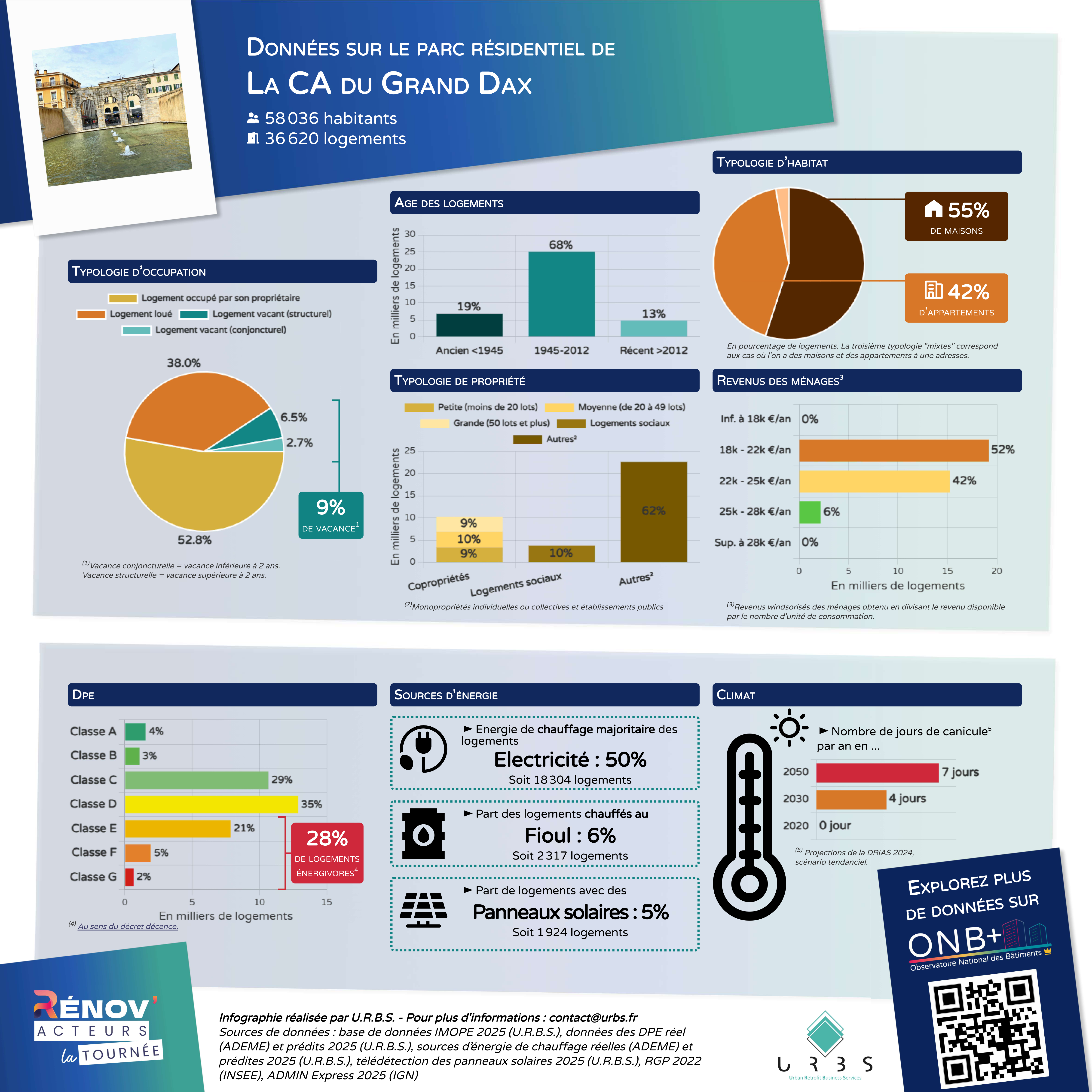 Territoire thermal au cœur d’un territoire à forte saisonnalité, l'Agglomération du Grand Dax concentre les enjeux de modernisation énergétique d’un patrimoine thermal énergivore et de requalification d’un parc résidentiel soumis à de fortes tensions liées au tourisme et aux curistes. La solution territorialisée passe par la rénovation performante du bâti existant pour maîtriser les charges, préserver l’identité architecturale, stabiliser l’offre de logements et soutenir durablement l’économie thermale locale.